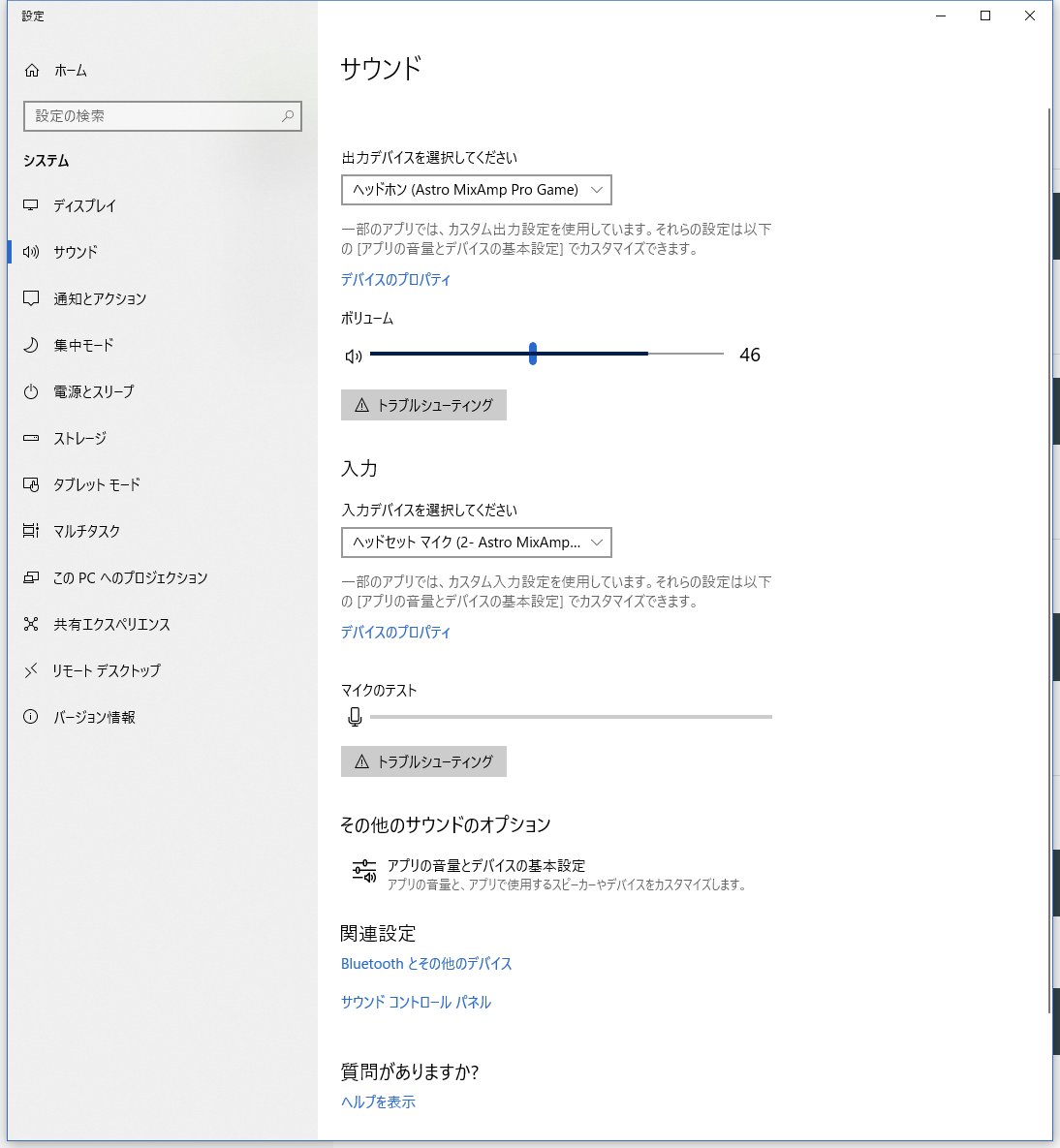 これについては、↓のようにWindows で出力を ヘッドホン (Astro MixAmp Pro Game) 、入力を ヘッドセット マイク (Astro MixAmp Pro Voice) に設定するとよいです。そうすると GAME が PC 音、VOICE がゲーム音に分かれます。直感と逆になってしまいますが取り敢えず分かれているので妥協します。PC ゲームを想定して作られているからな気がします。